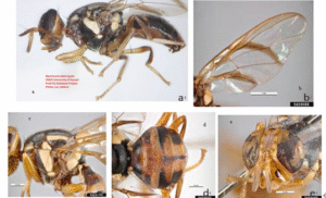 Bactrocera albistrigata a: Mặt bên trưởng thành (nguồn: www.herbarium.hawaii.edu/fruitfly/, ngày 7/11/2014); b: Cánh, c: Mặt bên mảnh lưng ngực, d: Bụng, e: Mặt (nguồn:http://www.forestryimages.org/browse/subinfo.cfm?sub=57283, ngày 7/11/2014)
